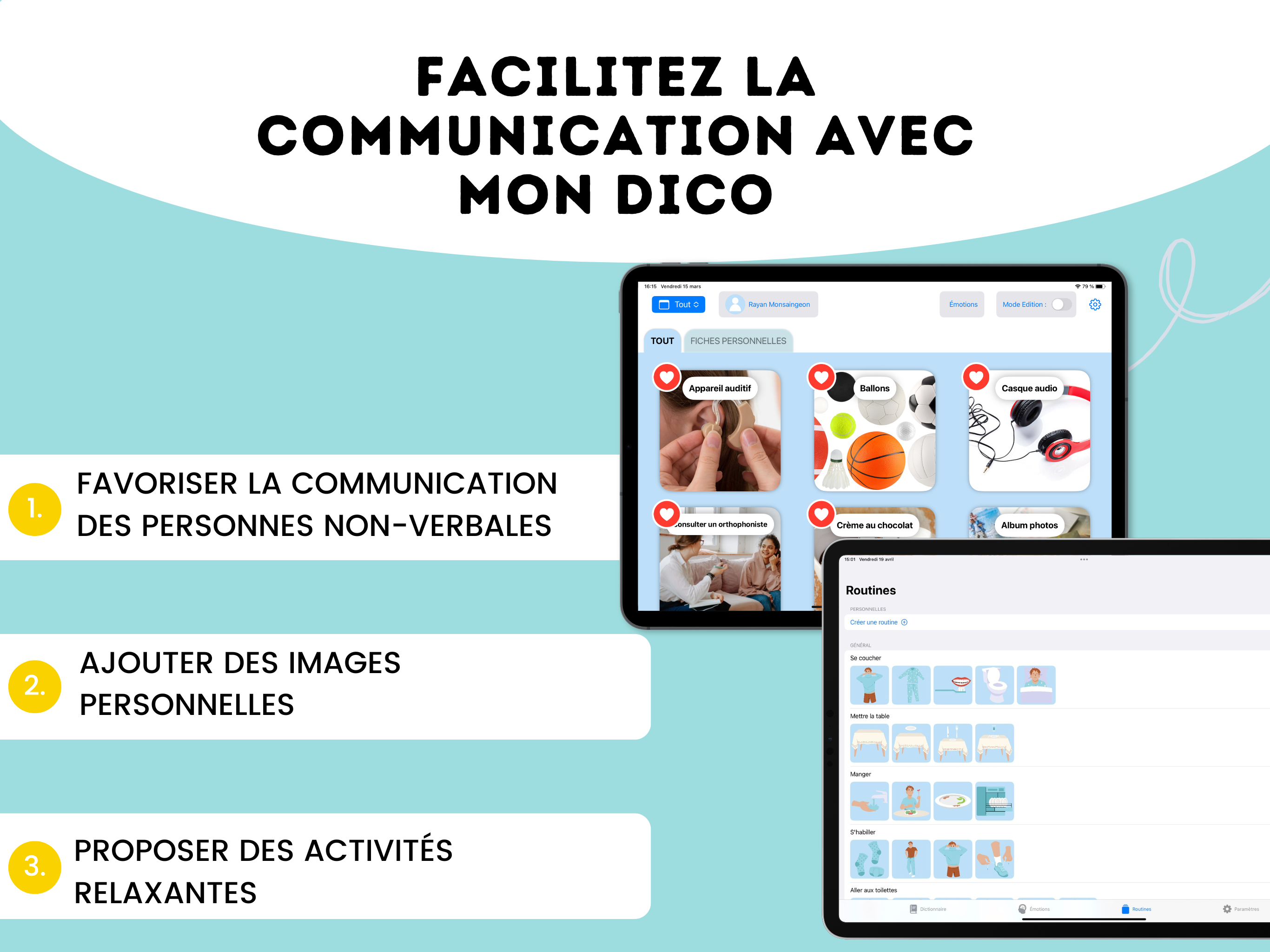 L’application Mon Dico de DYNSEO peut aider l’enfant à exprimer son besoin d’aller dans son coin calme. Avec des images réelles, il peut communiquer « j’ai besoin de calme », « je veux aller dans mon coin », « c’est trop pour moi ». Cette communication facilite l’utilisation autonome du coin calme et réduit la frustration de ne pas pouvoir exprimer ses besoins. Découvrez Mon Dico.