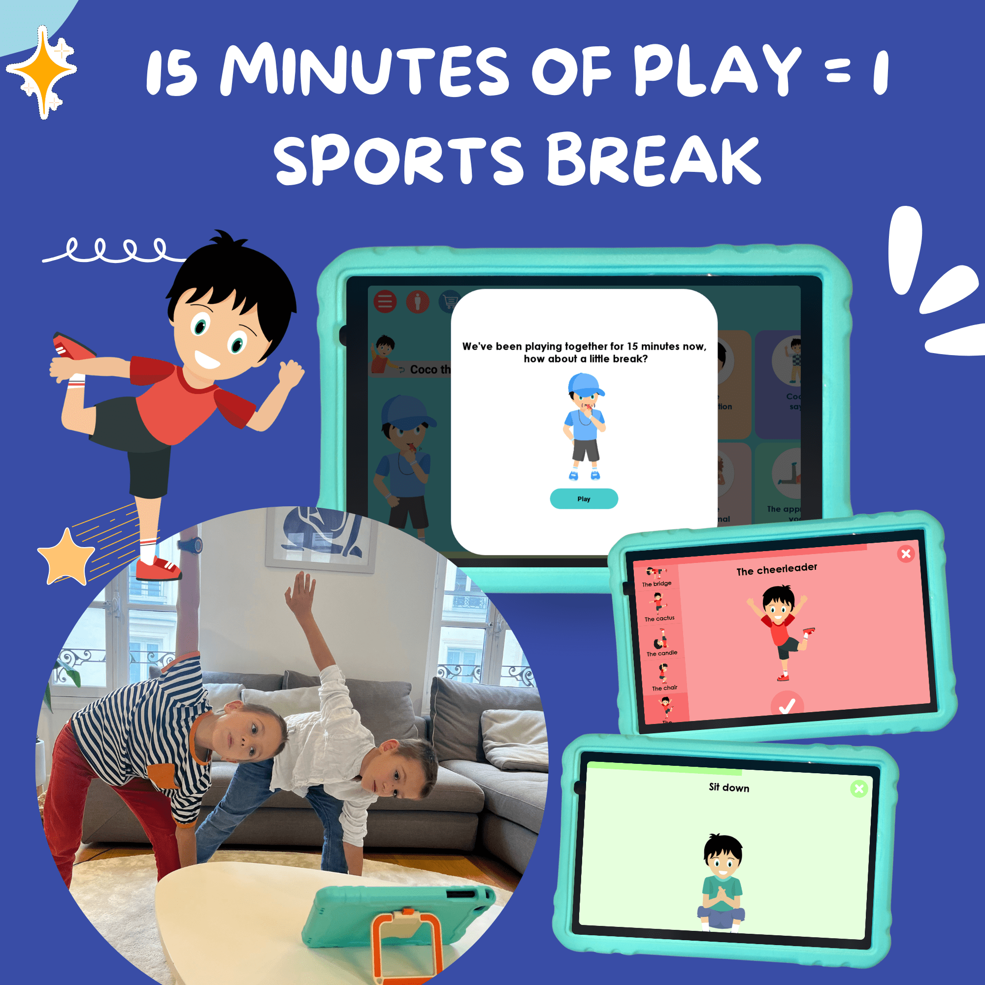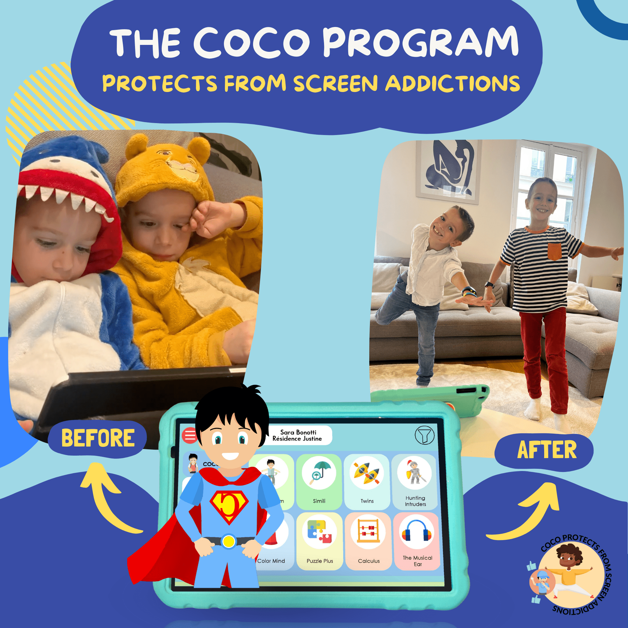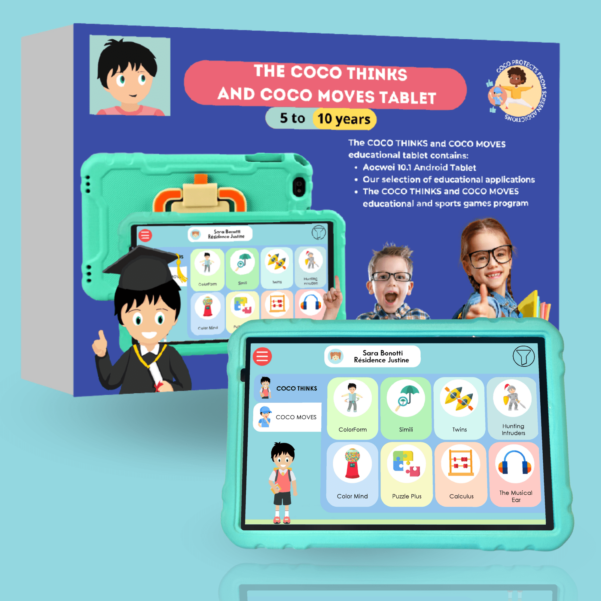 The COCO THINKS and COCO MOVES © educational tablet is the tablet for superheroes aged 5 to 10! It's a classic Android tablet, UJJ 10.1 inches, 32 GB. It comes fully installed, with optimized settings. It's still a classic tablet! You'll be able to play the educational and physical games program, COCO THINKS and COCO MOVES ©, the favorite of 5-10 year-olds. Coco is intelligent time, with a sports break every 15 minutes of screen time. Other apps include yoga for kids, stories, coloring books and Youtube for Kids.