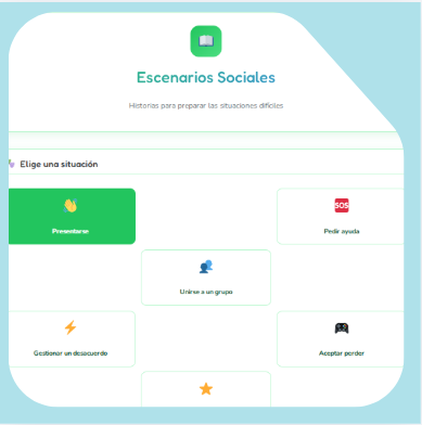 6 historias estructuradas para prepararte para situaciones sociales difíciles: presentarte, pedir ayuda, unirte a un grupo, manejar un desacuerdo, aceptar una pérdida, recibir un cumplido. Cada escenario desglosa la situación en 4 etapas: la situación, cómo me siento, qué puedo hacer, el resultado.