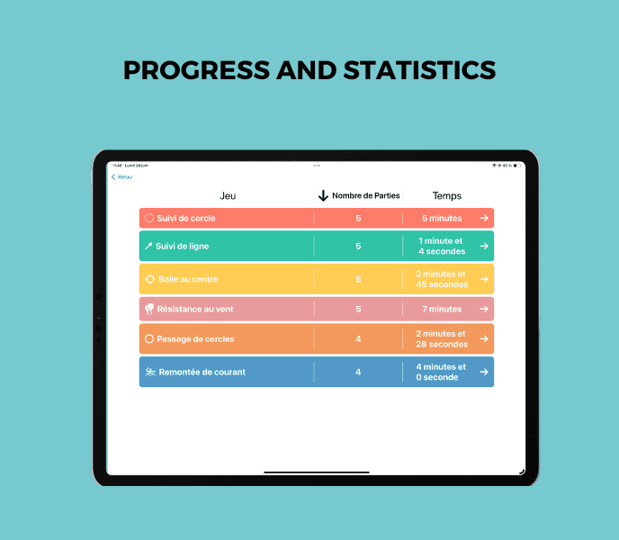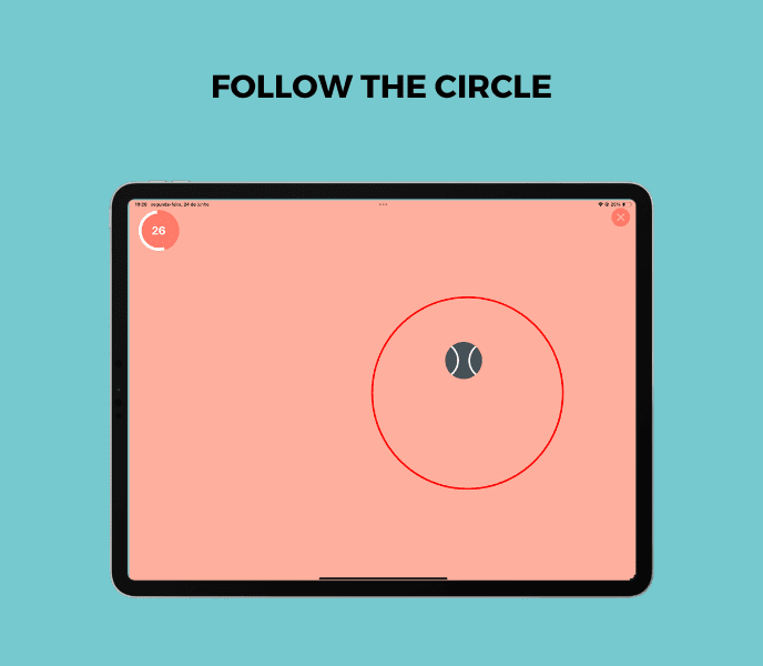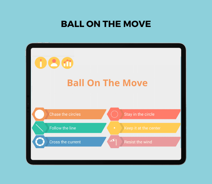 Ball On The Move es nuestra aplicación de habilidades motoras basada en una tableta. La tableta se utiliza como soporte de equilibrio para mover la pelota hacia el centro de la tableta. Se proponen varios ejercicios: Círculos de pases Pelota en el centro Seguimiento de círculos Seguimiento de líneas Ir contracorriente Resistencia al viento Se pueden variar muchos elementos, como el tamaño y la velocidad de la pelota. Esto hace que cada ejercicio sea parametrizable y personalizable. Ten en cuenta que esta aplicación sólo está disponible en tabletas Android.