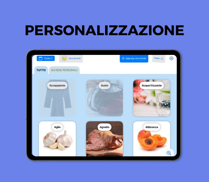 Puoi personalizzare le immagini in base ai profili dell’utente (famiglia, oggetti preferiti, attività preferite…) ma anche in base all’ambiente in cui si trova (dal dentista, alla sua stanza…).
