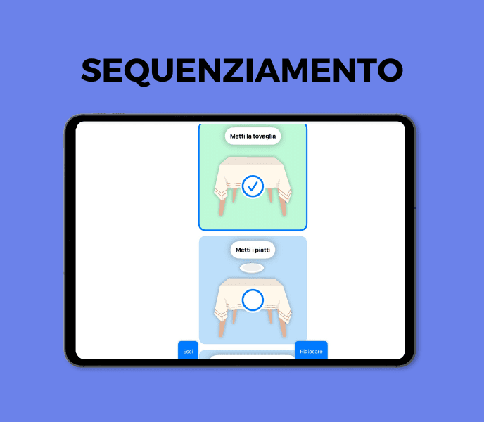 Sull’app Mio Dico puoi anche creare le tue routine con le nostre immagini da mischiare e adattare al profilo dell’utente. Puoi anche eseguire i passi della tua routine e giocare a trovare l’ordine giusto per fargli capire meglio l’ordine.
