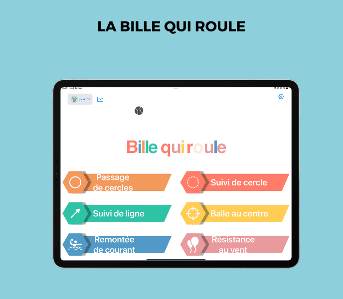 La Bille Qui Roule est notre application de motricité sur tablette. La tablette est utilisée comme support d'équilibre pour déplacer la balle vers le centre de la tablette. Plusieurs exercices sont proposés :